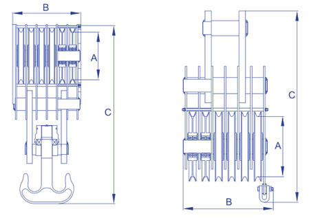 | 產(chǎn)品型號(hào) | 名稱 | 鋼絲繩直徑 (mm) | 額定載荷 (t) | A (mm) | B (mm) | C (mm) | 自重 (kg) |
